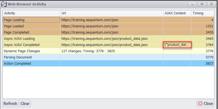 When we load any URL on a dynamic browser it loads many other requests and their responses along with the original URL request. For example, when we load the web page https://training.sequentum.com/json it also loads multiple Ajax requests and their responses which you can easily see on the Web Browser Activity window as highlighted in the screenshot below: