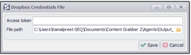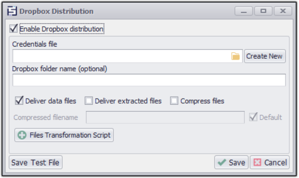 When an agent saves data to Dropbox, the agent can save the data files in a single compressed file or as individual data files. In the Dropbox Distribution panel, you must specify credentials for a Dropbox service account.
